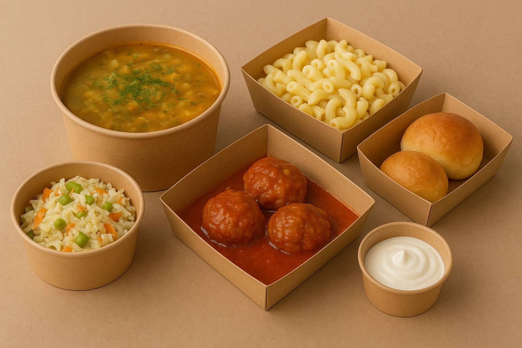 Сытный и сбалансированный бизнес-ланч в крафтовой упаковке — рассольник Ленинградский, тефтели в ароматном соусе с гарниром из макарон, салат “Застольная”, свежие булочки и сметана. Домашний вкус и идеальный баланс на каждый день!.